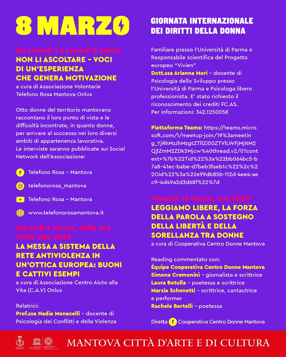 L’evento rientra nel calendario di iniziative del Comune di Mantova previste in concomitanza con le celebrazioni della Giornata Internazionale della Donna del 8 marzo.