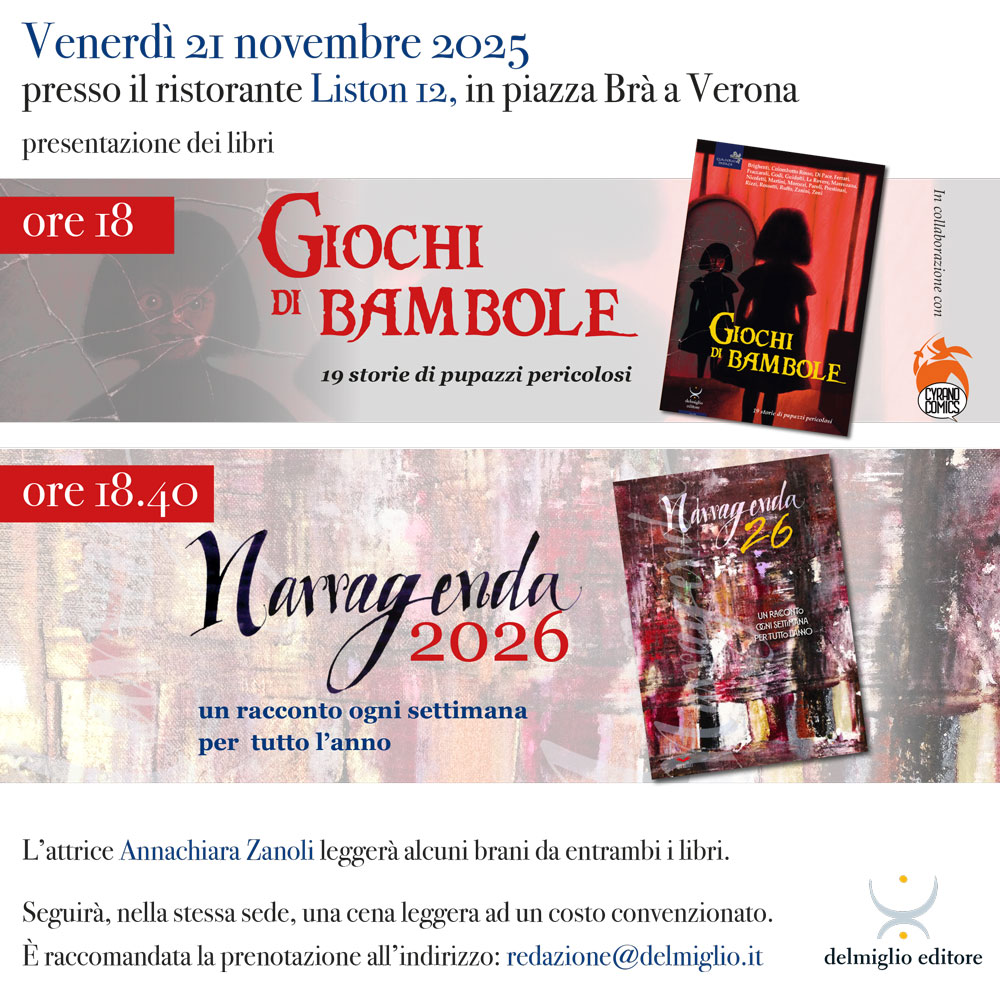 “Narragenda 2026” sarà presentata a Verona venerdì 21 novembre 2025 presso il Ristorante Liston 12 in Piazza Brà, con letture dell’attrice Annachiara Zanoli e alla presenza del curatore ed editore Emanuele Delmiglio. La serata avrà inizio alle 18,00 con la presentazione dell’antologia di racconti sul tema delle bambole assassine “Giochi di bambole” e dalle 18,40 con la presentazione di “Narragenda 2026”, cui presenzierà anche Simona Cremonini.